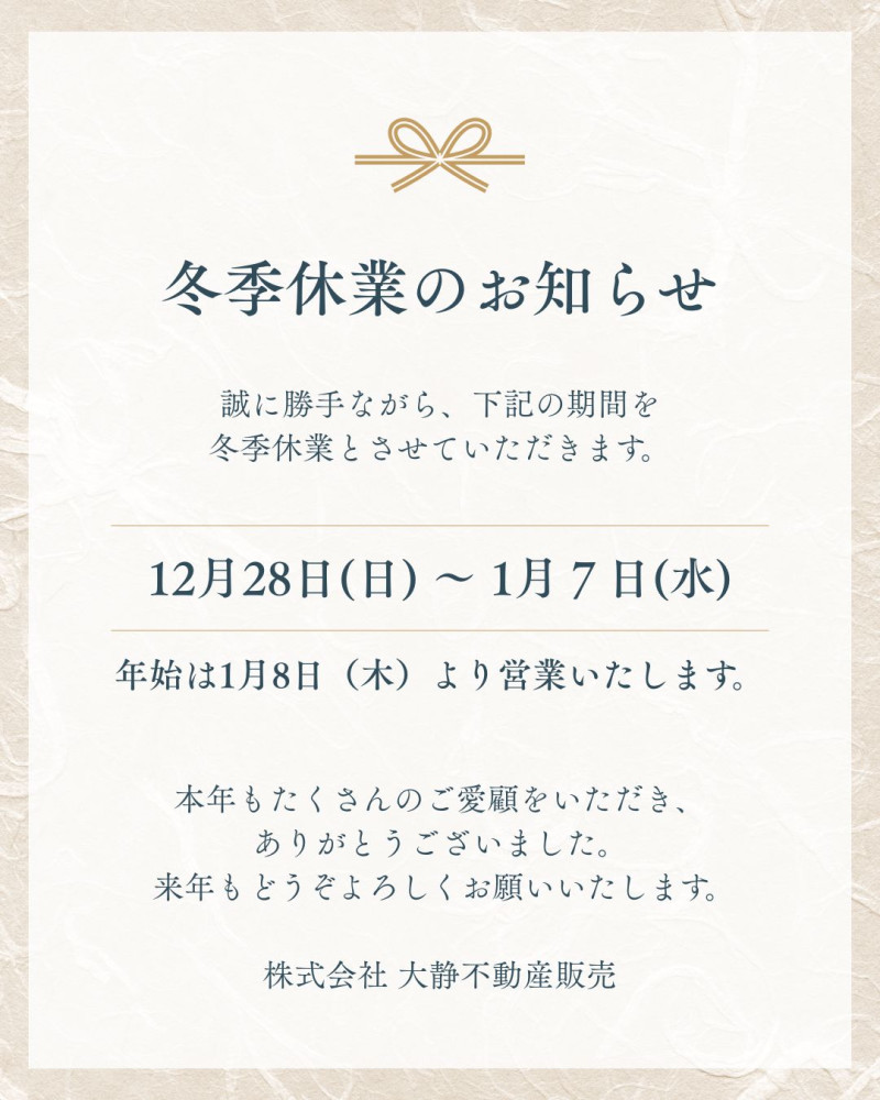 \年末年始休業日のお知らせ/|大静不動産販売(たいせいふどうさんはんばい)のスタッフブログ